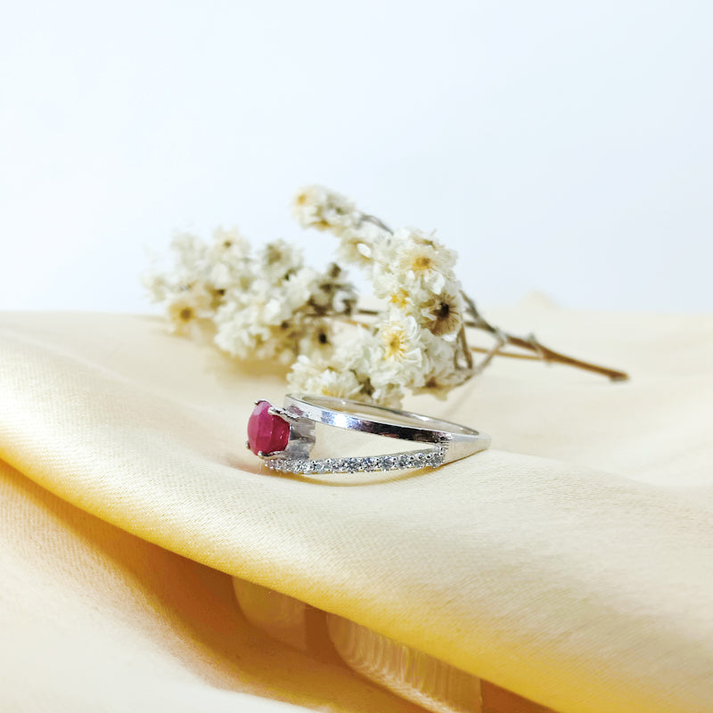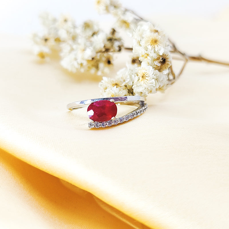 Celebrate fiery love with this Rihanna-inspired engagement ring featuring a radiant red ruby simulant in an elegant oval cut, wrapped in a sleek split silver band lined with shimmering CZ diamonds.